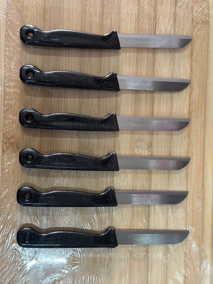 Orijinal Solingen Altı adet siyah saplı, keskin bıçaklardan oluşan meyve ve sebze kesimi için uygun bıçak seti