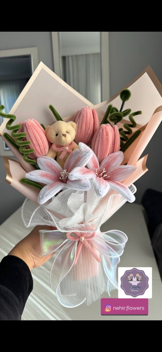 Pastel pembede peluş laleler ve zambaklar ile küçük peluş ayıcığın yer aldığı, solmayan çiçek. Hazırlanma süresi 3 gündür.