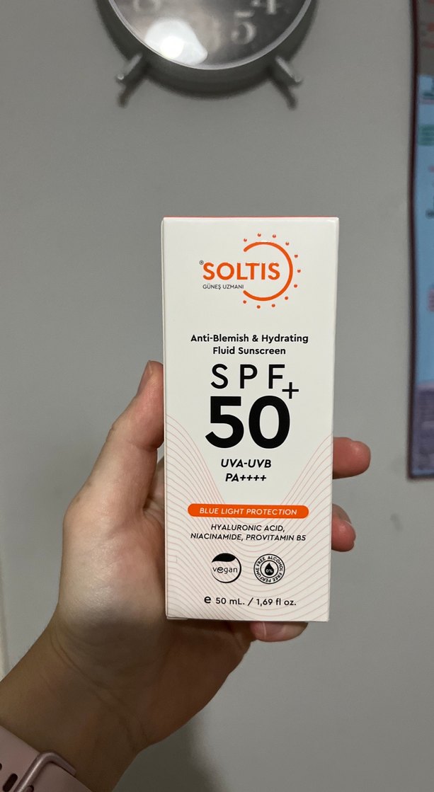 Soltis SPF 50+ güneş koruyucu, geniş spektrum UVA ve UVB koruması sağlar. Hyaluronik asit, niasinamid ve provitamin B5 ile cildi nemlendirir ve leke oluşumunu önlemeye yardımcı olur. Mavi ışık koruması da sunar. 50 mL. 1 kez kullanıldı