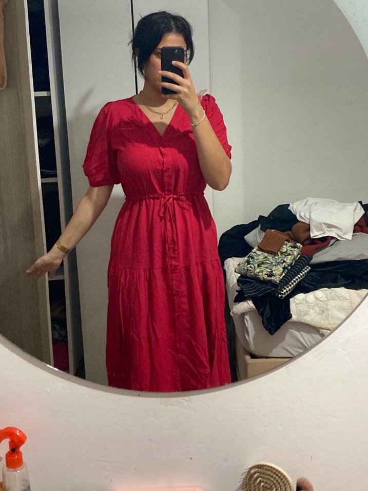 Parlak kırmızı sentetik kumaştan, V yaka ve kısa kollu midi elbise. Düğmeli ve belden bağlamalı, bol kesim. Trendy gündelik tarz için ideal.
