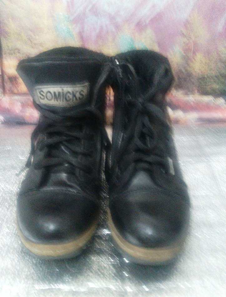 SOMICKS markalı, yılan desenli siyah dolgu topuklu kauçuk botlar. Tokalı detaylarıyla günlük kullanıma uygun, punk rock tarzında.