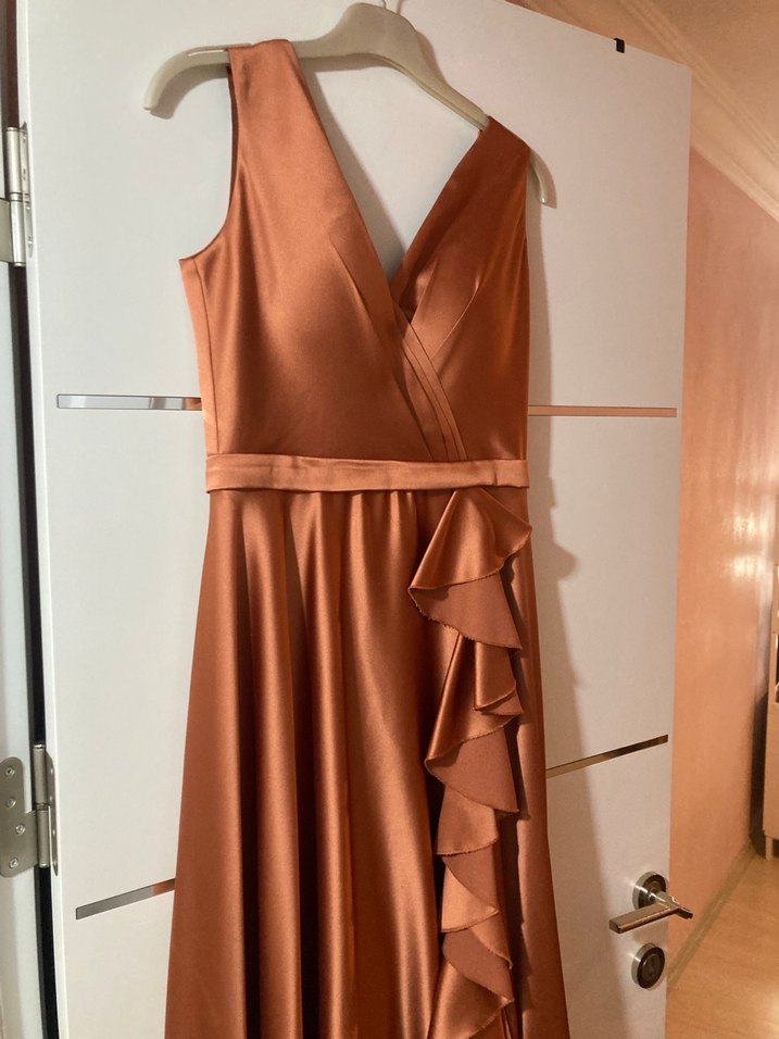 Kolsuz, v yaka ve drapeli tasarıma sahip, parlak bej kumaştan uzun ve dar kesim abiye elbise. ✨