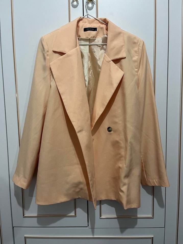 Somon renkli, düğmeli ve normal boy blazer. Uzun kollu, kesimi rahat ve ipeksi dokusu ile ofis veya günlük kullanıma uygun.