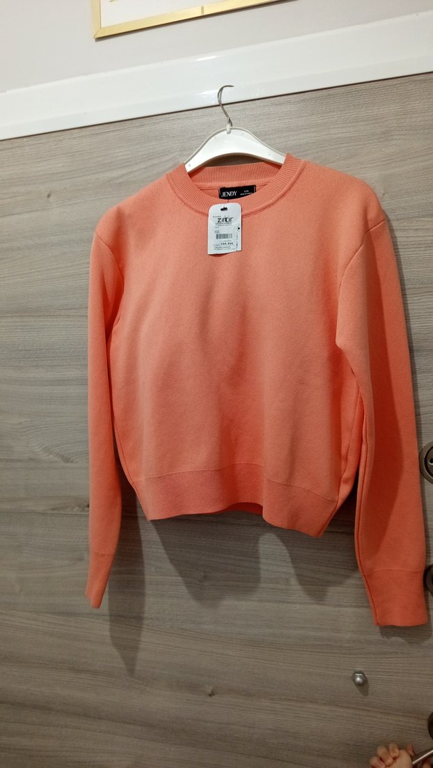 Somon, yuvarlak yaka, uzun kollu, kısa kesim, bol kalıp kadın Kazak. Günlük rahat kullanım için yumuşak kumaş ve desensiz tasarım.S-XXL bedene kadar rahat olur