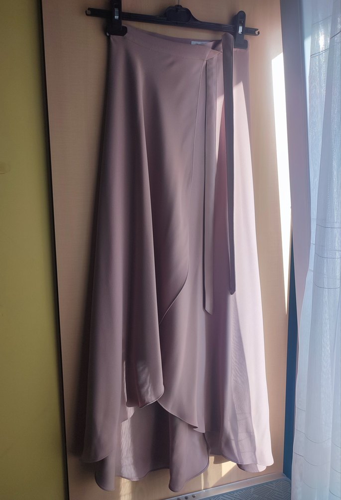 Drapeli ve bol kesimli uzun kadın eteği, pembe somon renk, özel günlerde, çağdaş ofis stiline uygundur. Sorunu yoktur. Mezuniyette bir defa giyilmistir.