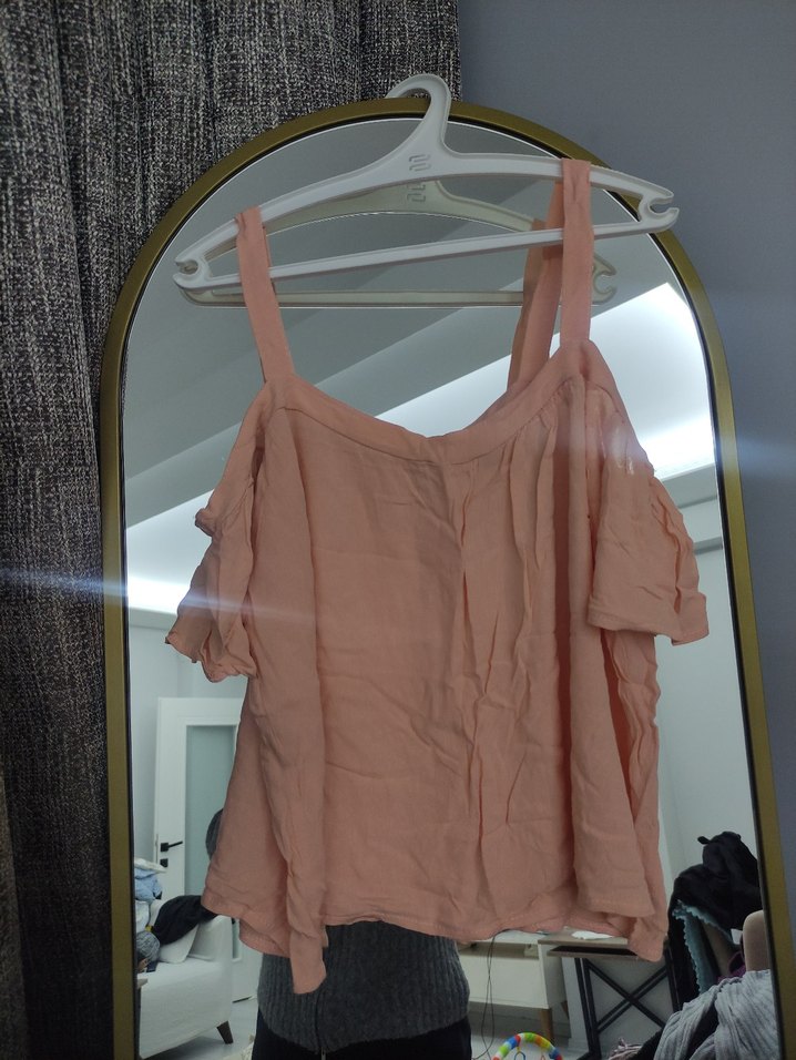 Pastel somon renkte, askılı, bol kesim ve drapeli kadın bluz, yumuşak kumaştan üretilmiştir. Görüldüğü gibi ölçüleri de ekledim