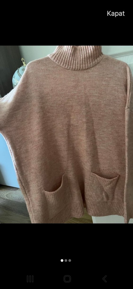 Bej renkli, boğazlı ve bol kesim örgü kadın kazak, uzun kollu ve iki ön cepli, rahat sokak stiline uygun.