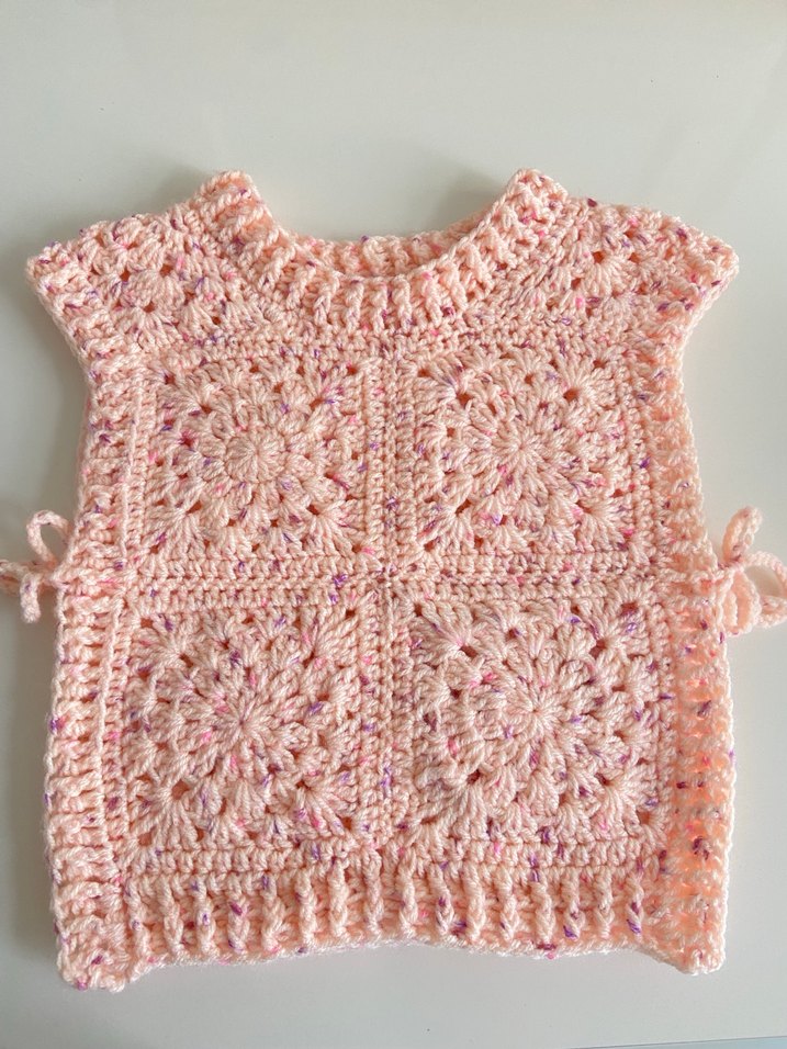 Pastel somon renkli, bohem tarzda, örgü detaylı, geniş kesim ve kolsuz kız çocuk süveteri. Yuvarlak yakalı, retro görünümlü bir modeldir.omuzdan aşağısı 34 cm genişlik 28 cm