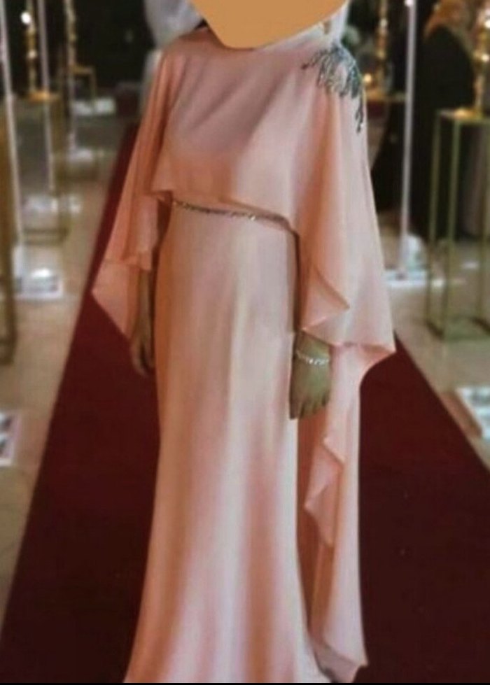 somon renkli, askısız, bol kesim, drapeli ve desenli uzun abiye elbise, düğün için uygundur. arka kısmı isteğe göre giyilebilir çıkarılabilir detaylı omuz taş işlemelidir . belindede işlemesi mevcuttur.kollarinda şık düğmeleri vardır.elbise sıfır hiç giyilmedi.alvina marka harika bir kumaşa sahiptir.