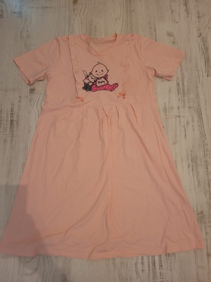 Somon rengi emzirme geceliği, kısa kollu ve bol kesimdir. Ön kısmında bebek baskısı ve emzirme için düğmeler bulunur. Rahat ve kullanışlıdır. Doğumdan sonra 2 3 kere giydim sadece.