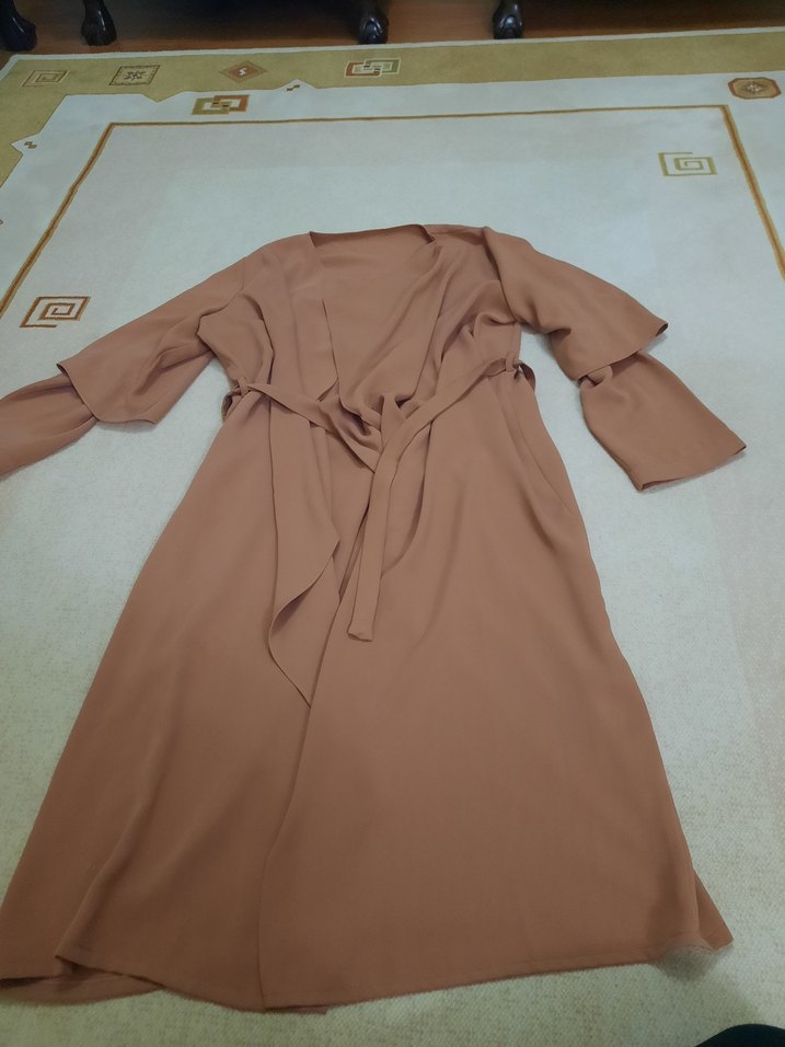 somon renkli, bol kesim, uzun kollu ve kuşaklı uzun tunik. Minimalist ve bohem tarzda, desensiz, yumuşak kumaştan yapılmıştır.
