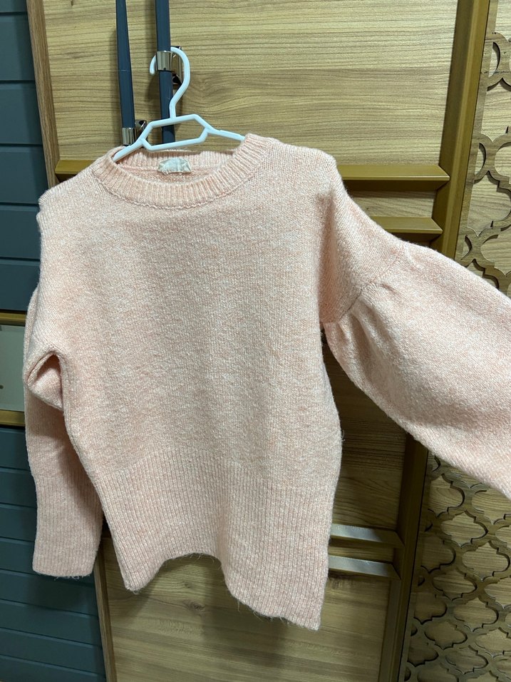 Bej renkli, örgü kadın kazak; yuvarlak yaka, uzun kollu, bol kesim ve normal midi boyda, rahat ve gündelik stil için uygundur.