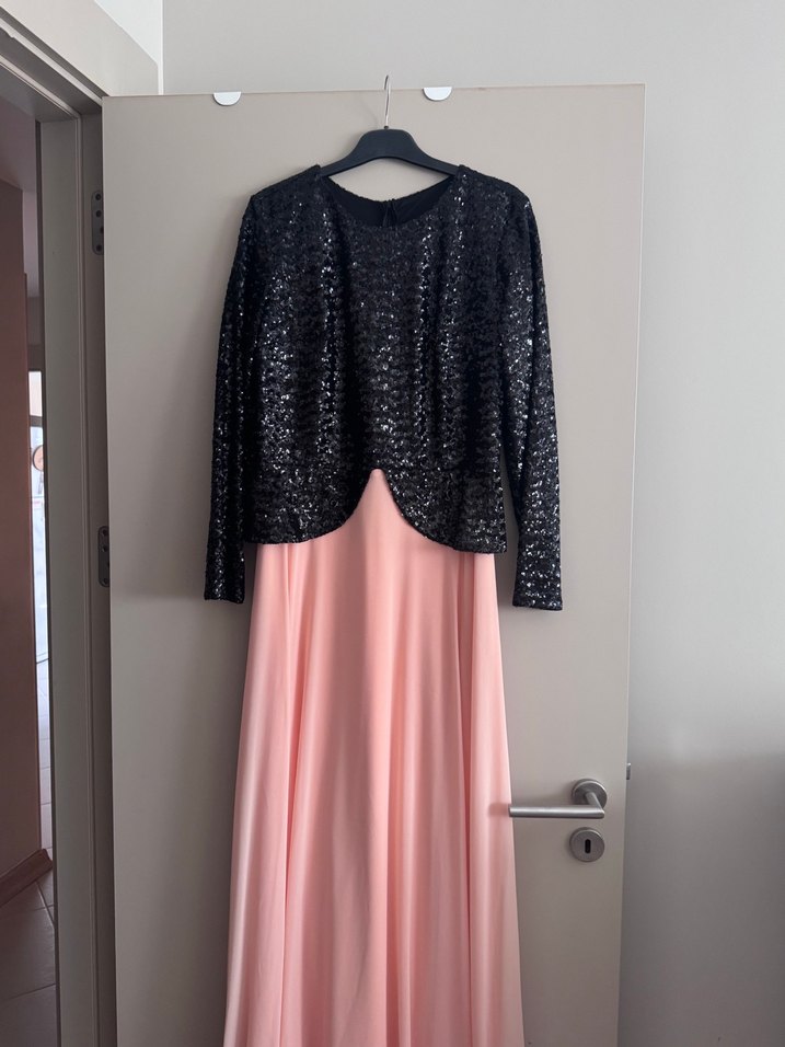 Uzun, pembe renkte, bol kesim ve drapeli kadın abiye elbise. Askısız yaka detaylı, parlak ve şık görünümüyle parti için uygun. Beden 44 yazıyo lakin kalıbı dar 38/40 bedene uygun 1 kere giyildi elbiseyle özel yapım uyumlu esarbınıda verıyorum