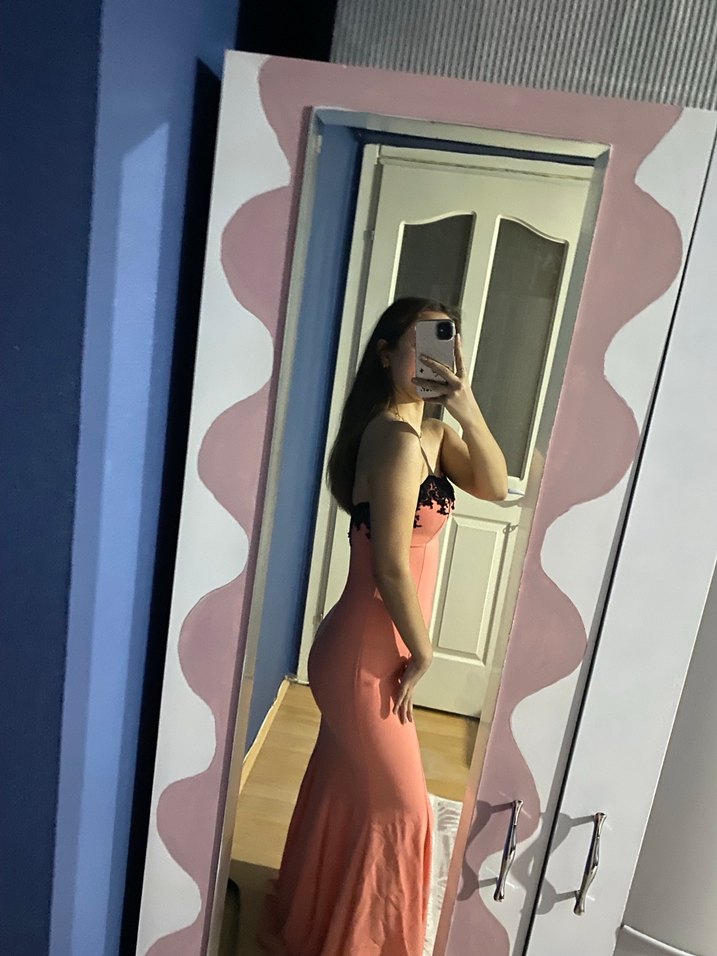 Fitted kesim, pembe renkli uzun abiye elbise, straplez yaka ve ince askılar ile birlikte yırtmaç detayına sahiptir. Desensiz, şık ve sade tasarım.