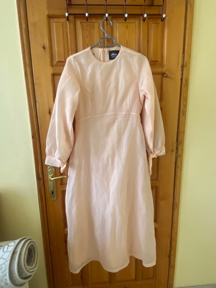 Somon renkte, keten kumaştan yapılmış, uzun kollu, drapeli ve bisiklet yaka detaylı bohem tarzda uzun elbise. Rahat kesim . Suud marka