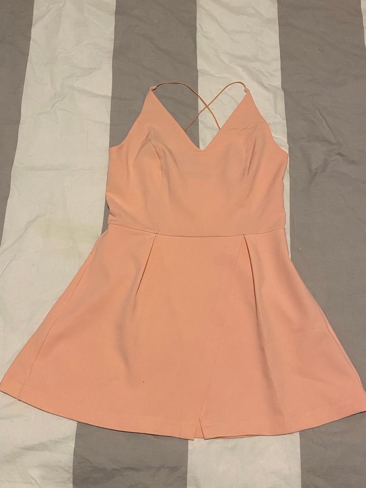 Somon, V yaka ve çapraz askılı kısa elbise, yumuşak sentetik kumaştan. Minimalist ve desensiz tasarımıyla partiler için zahmetsiz şıklık sunar. M-L Beden.