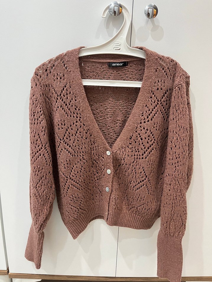 Somon örgü, V yaka ve uzun kollu kadın hırka. Dar kesim, midi boy ve bohem tarzıyla günlük kullanıma uygun rahat bir parça.