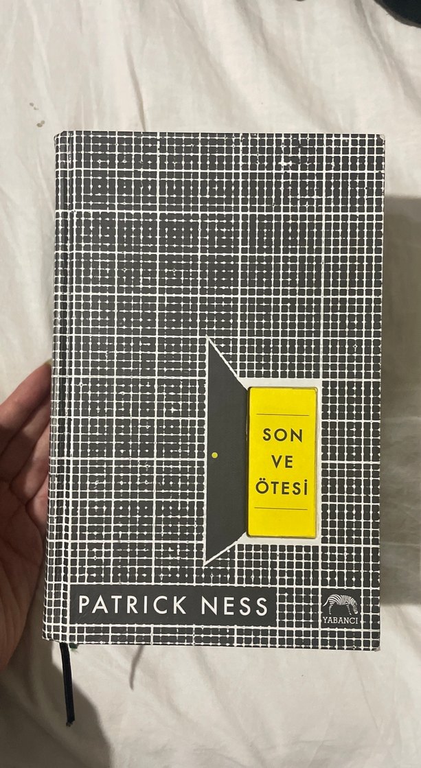 Patrick Ness'in 'Son ve Ötesi' adlı romanı siyah beyaz desenli kapağa ve sarı kapı çizimine sahip.