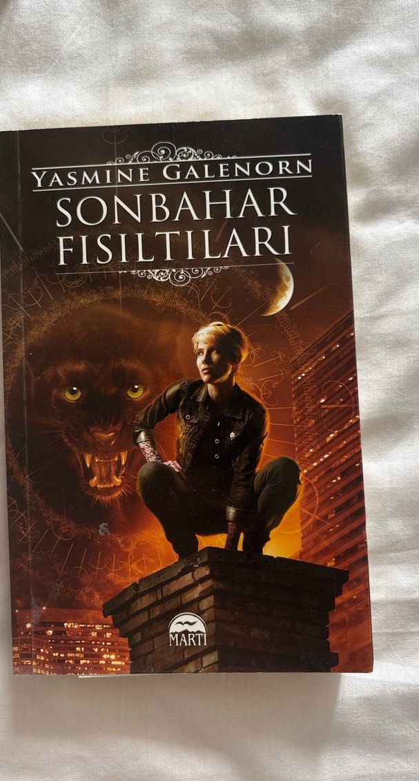 Yasmine Galenorn'un Sonbahar Fısıltıları adlı romanı, ay ışığı altında bir kadın ve panterin olduğu gizemli kapak tasarımına sahip.