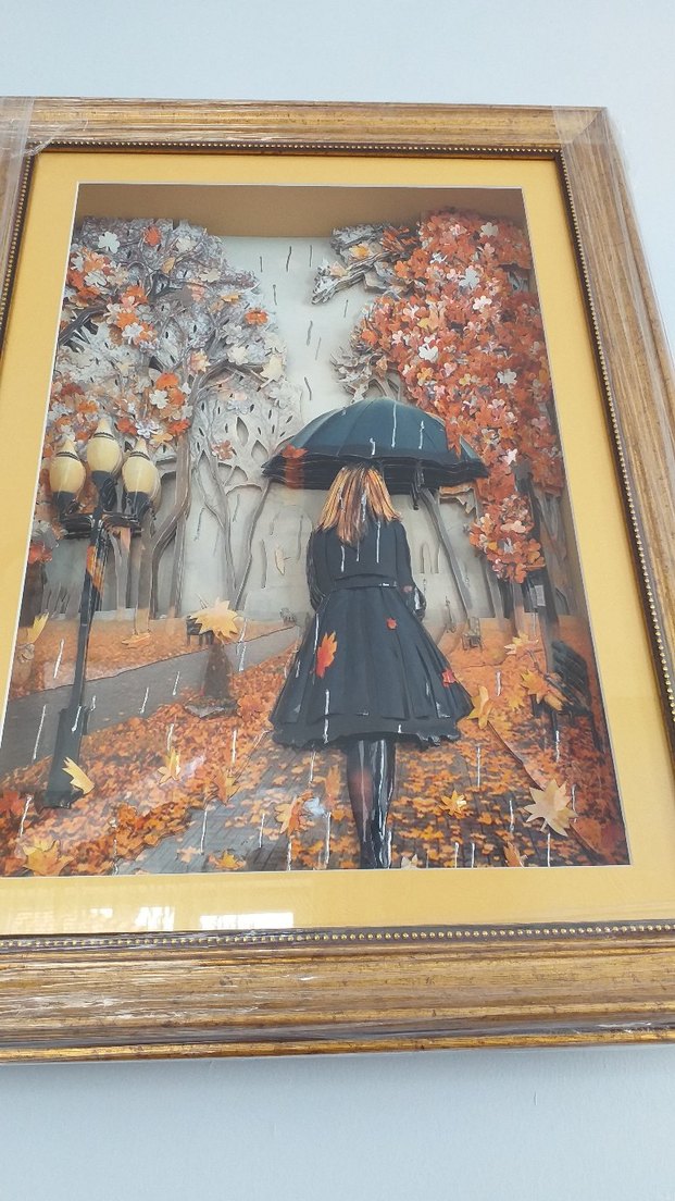 Bu yağlı boya tablo, sonbahar temalıdır ve altın ile turuncu yapraklar arasında şemsiye taşıyan bir kadını gösterir.