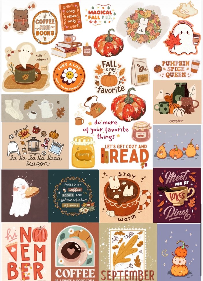 Sonbahar temalı, kahve, balkabağı, kitap ve sevimli karakterler içeren sıcak ve büyülü atmosferli eğlenceli çıkartmalar.