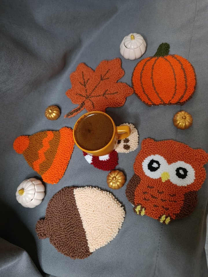 Koyu kahverengi ve turuncu tonlarında kabak, baykuş, yaprak, palamut ve bere şeklinde sonbahar temalı örgü bardak altlıkları isteğe göre yapılmamtadır.