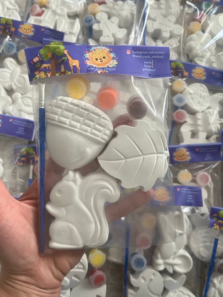 Yaprak, palamut ve sincap figürlerinin boyanabilir modelleri ile 3 renk boya ve 1 adet fırça içeren set.