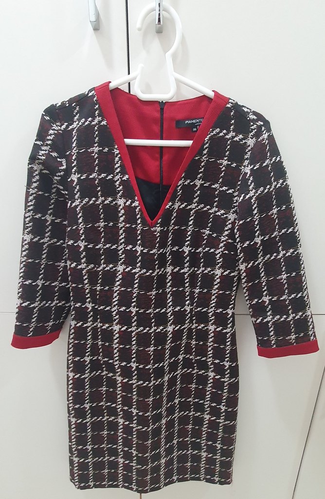 Gunluk ya da ofis kullanimina uygun bir elbise. Arkadan fermuari mevcut. Kizilkahve tonlarinda kareli, yaka ve kol uclarinda kirmizi biye var.