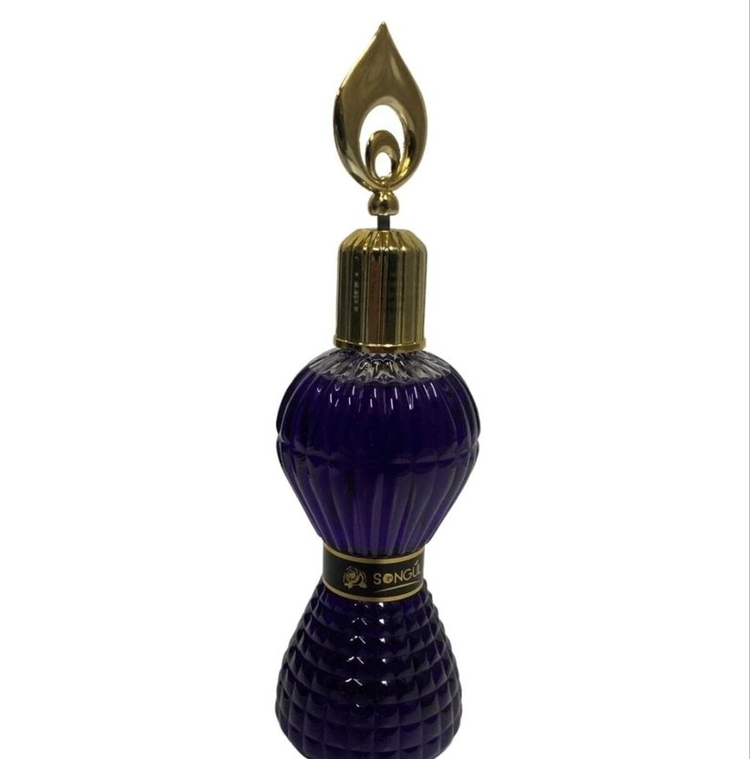 Songül Kolonyası, altın kapaklı ve mor renkte dekoratif bir şişede sunuluyor. Eşsiz bir koku deneyimi sağlar.