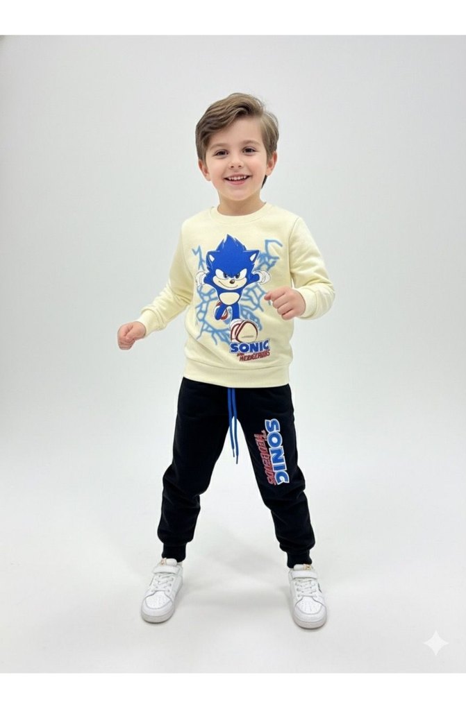 Renkli baskılı sarı polar üst ve Sonic baskılı siyah pantolonlu, rahat kesim erkek çocuk eşofman takımı. Üstü bisiklet yaka, 3-10 yaş