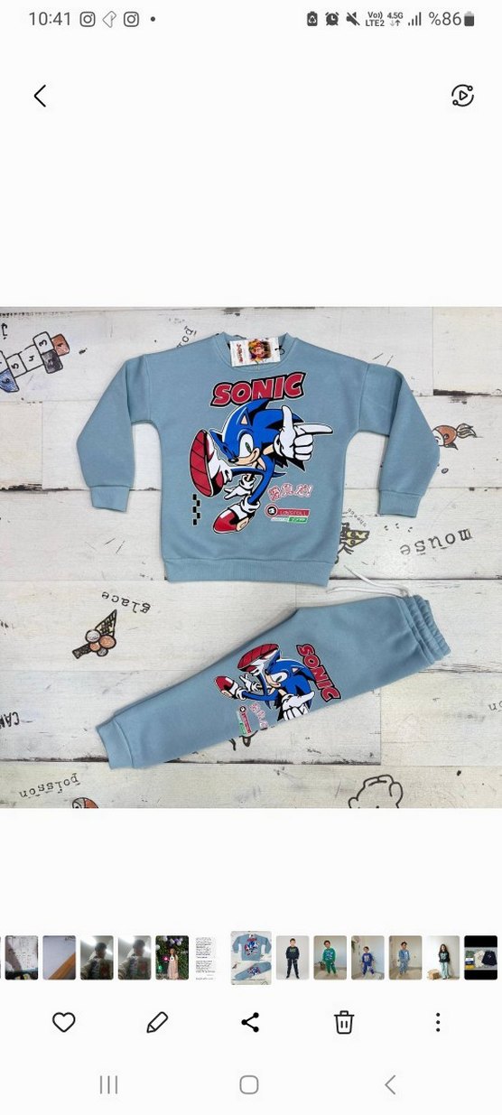 Mavi renkli, yumuşak kumaşlı erkek eşofman takımı, rahat kesim ve bisiklet yaka ile. Renkli Sonic baskısı ve cırt cırt detayları bulunur.