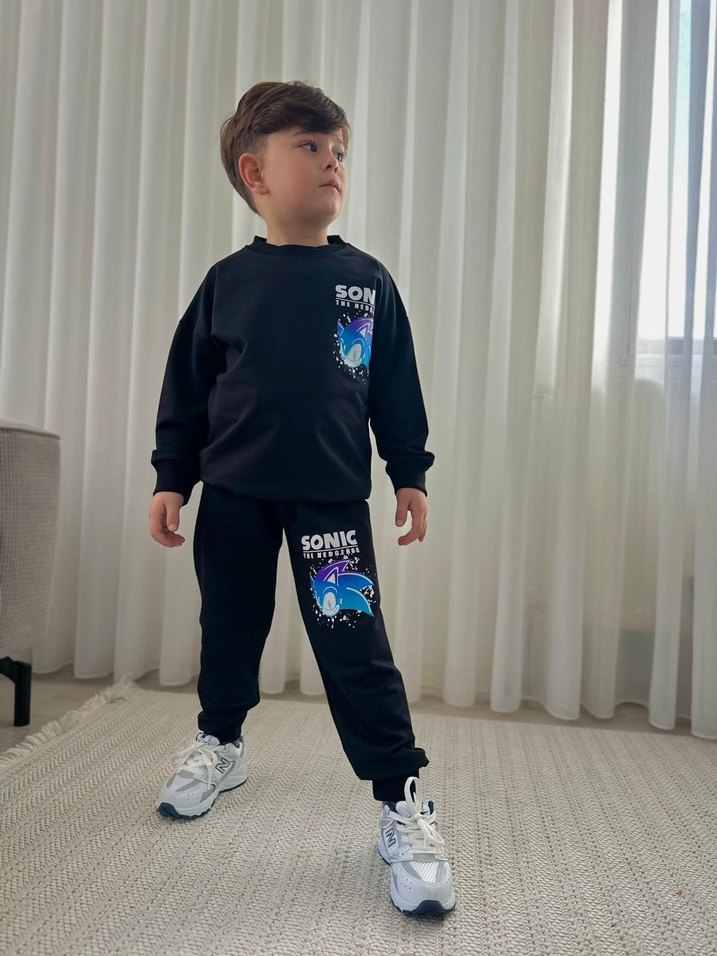 Sonic baskılı siyah, bol kesim polar kumaş sweatshirt ve eşofman altı. Velcro detaylı, bisiklet yaka, sokak stiline uygun.
