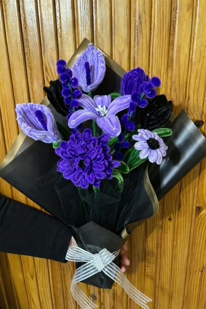 mor ve siyah detaylı şönil çiçek buketi sevdikleriniz için hiç solmayacak çiçek buketi.