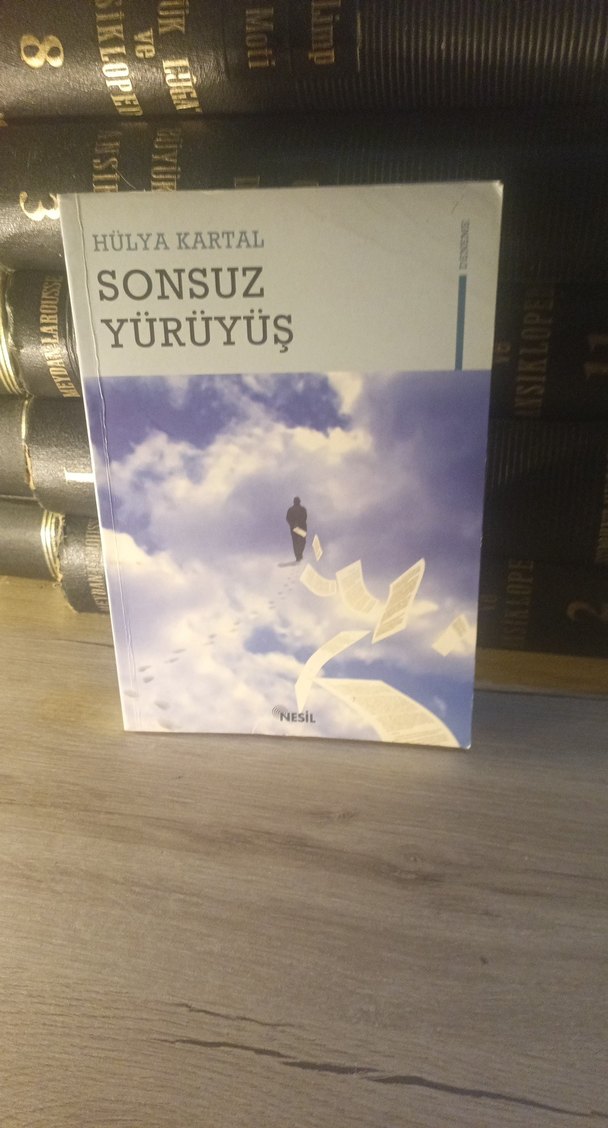Hülya Kartal'ın "Sonsuz Yürüyüş" adlı romanı, bulutlu gökyüzünde uçuşan kağıtlar arasında yürüyen birini gösteren kapakla derin temaları işliyor.