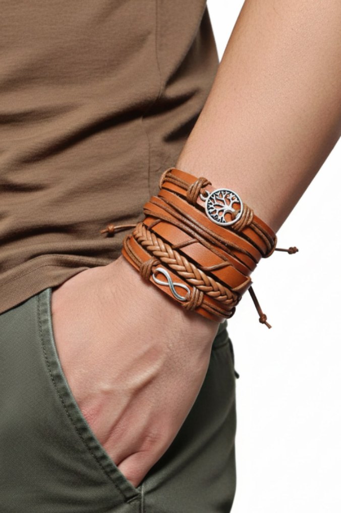Sonsuzluk Ve Hayat Ağacı Tasarım Taba 5'li Hakiki Deri Bileklik