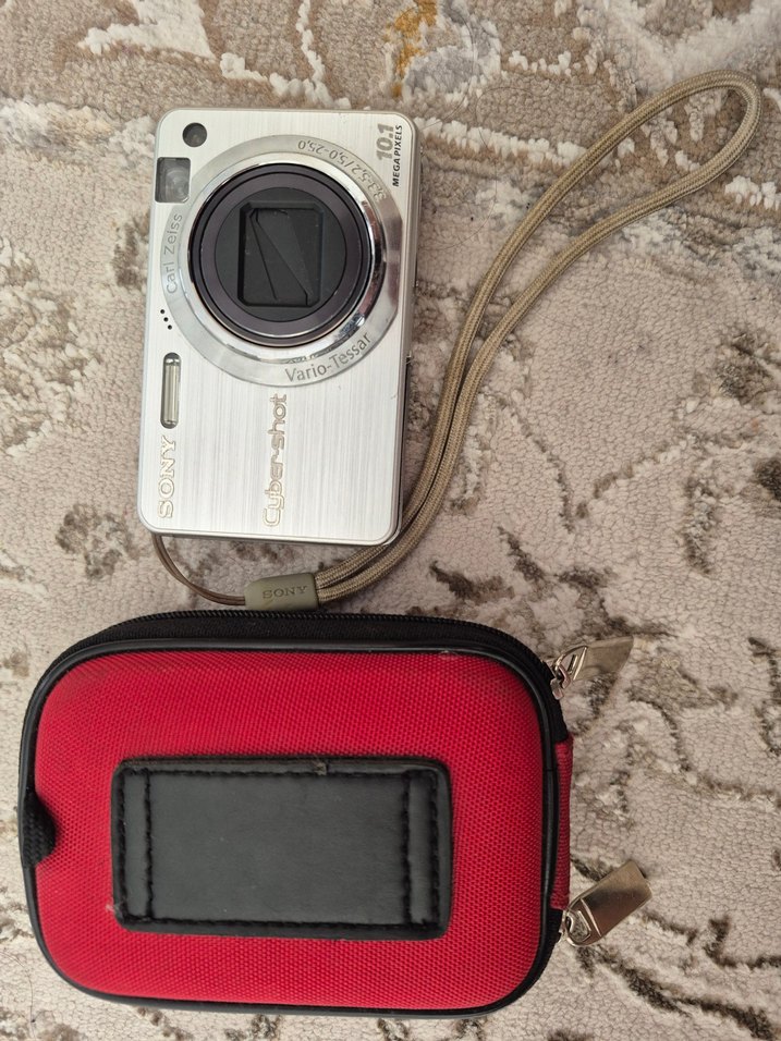 Gri renk Sony dijital kamera 10.1 MP sensör ve Vario-Tessar lens içerir. Kırmızı koruyucu taşıma kılıfı ile birlikte sunulur. Kozmetik olarak sorunsuzdur sadece batarya kapağı kırılmıştır. Batarya şarj adaptörü olmadığı için ürününün çalışır durumunu gösteremedim maalesef ama ürün sorunsuz çalışıyor. Vizör, tuşlar, flash vs. her şey sorunsuz çalışmaktadır.
