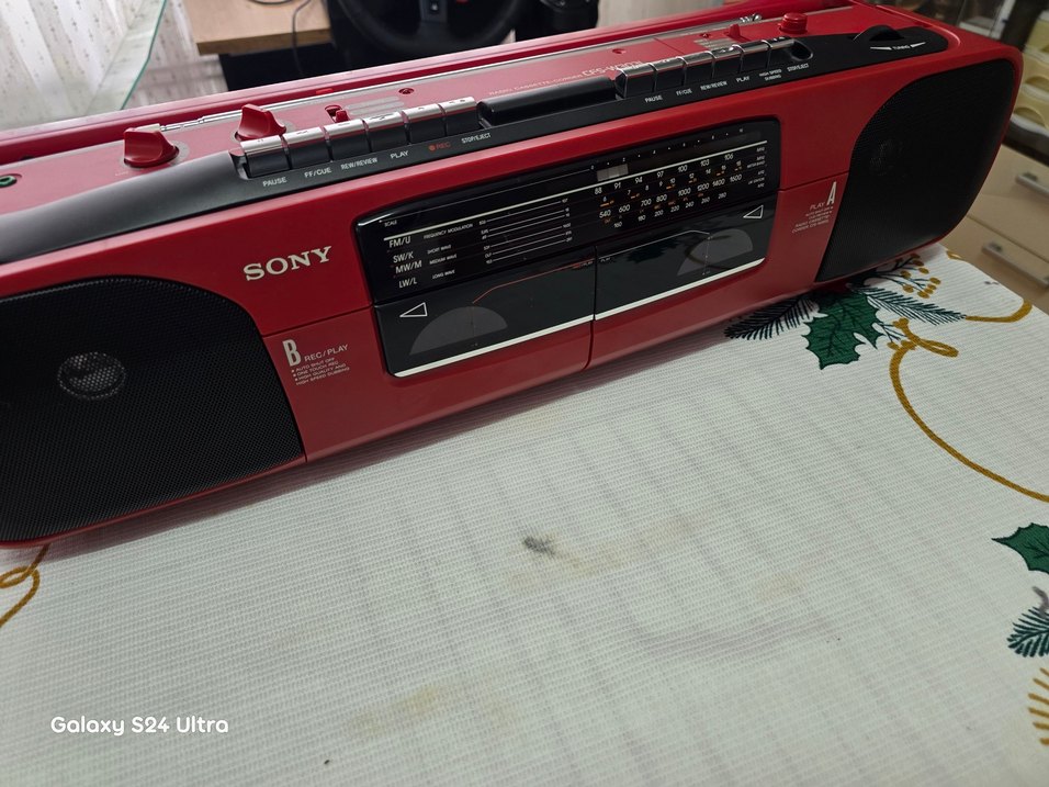 SADECE KUTUSU YOK Sony marka, kırmızı renkli müzik sistemi. AM/FM radyo ve kaset çalar özelliklerine sahiptir.