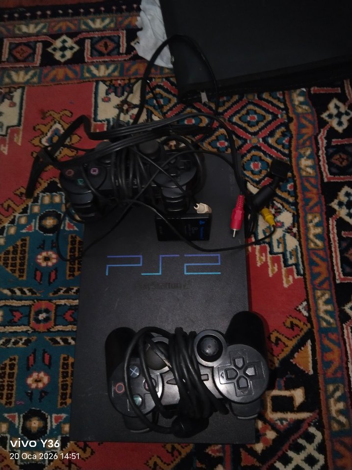 Sony PlayStation 2 konsol, iki kablolu kumanda ve AV kabloları ile birlikte. Konsol desenli bir zeminde yer almakta.