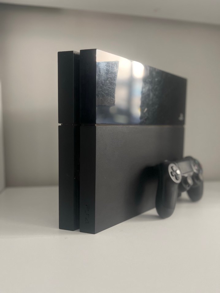 Sony PlayStation 4 oyun konsolu, şık siyah tasarım ve kablosuz kontrolcü ile birlikte gelir. Oyun deneyimi için uygundur .