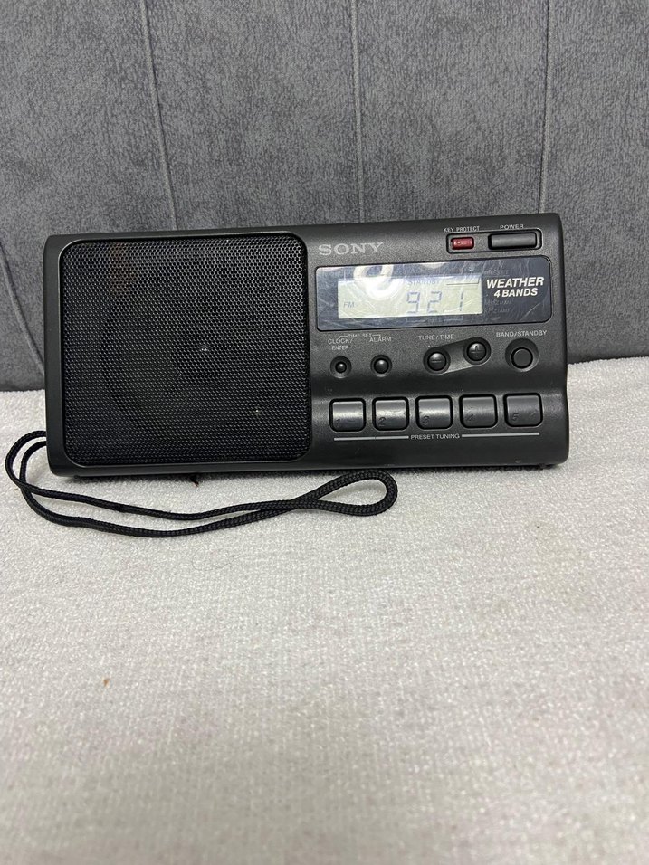 Sony marka siyah taşınabilir radyo, dijital ekran ve hava durumu bantlarını destekler. Kolay kullanım için bileklik askısı bulunur.