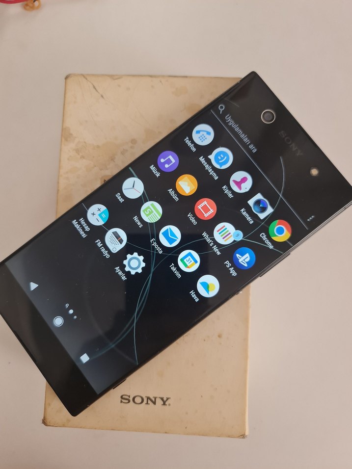 Sony marka Android telefon, kırık ekranlı ve orijinal bej kutusuyla birlikte. saglam.