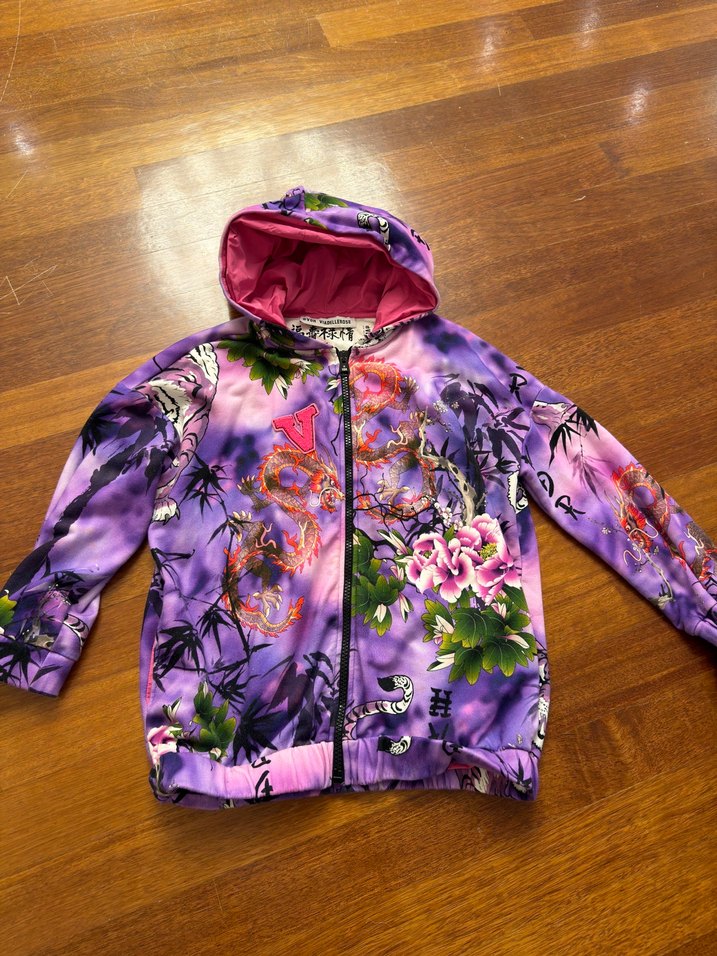 Mor renkli, çiçek ve ejderha desenli, kapüşonlu ve fermuarlı kız çocuk ceketi. Bol kesimli, bohem ve retro tarzda renkli bir tasarım sunar.