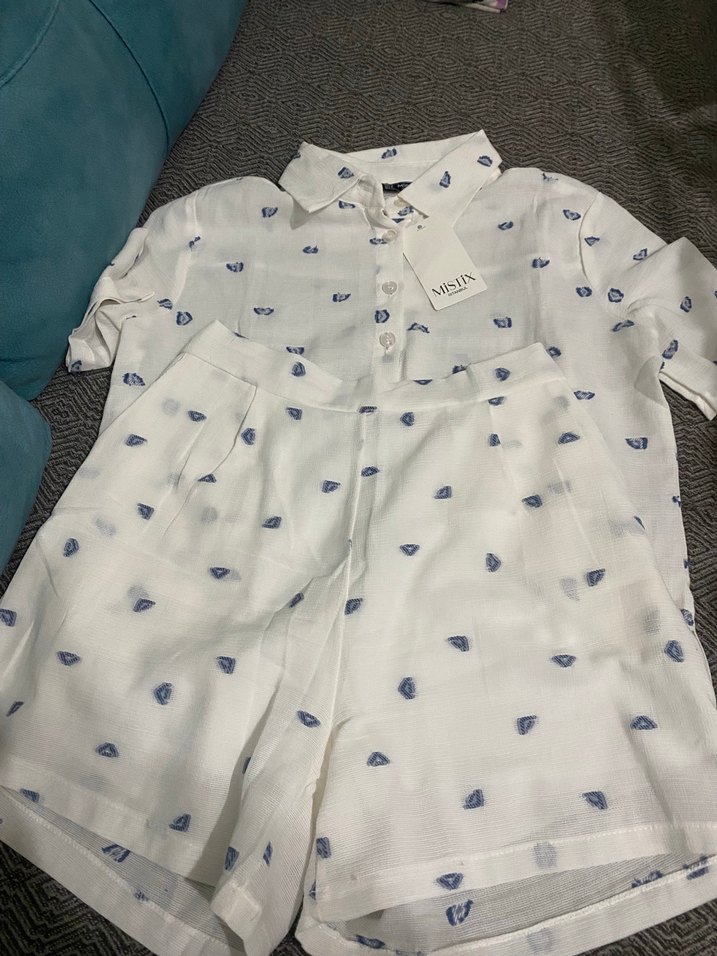 Düğmeli, kısa kollu, beyaz pamuk gömlek, mavi desenli, salaş kesim, yakalı, rahat sokak stili için uygundur. Şortlu takım hiç giyilmedi