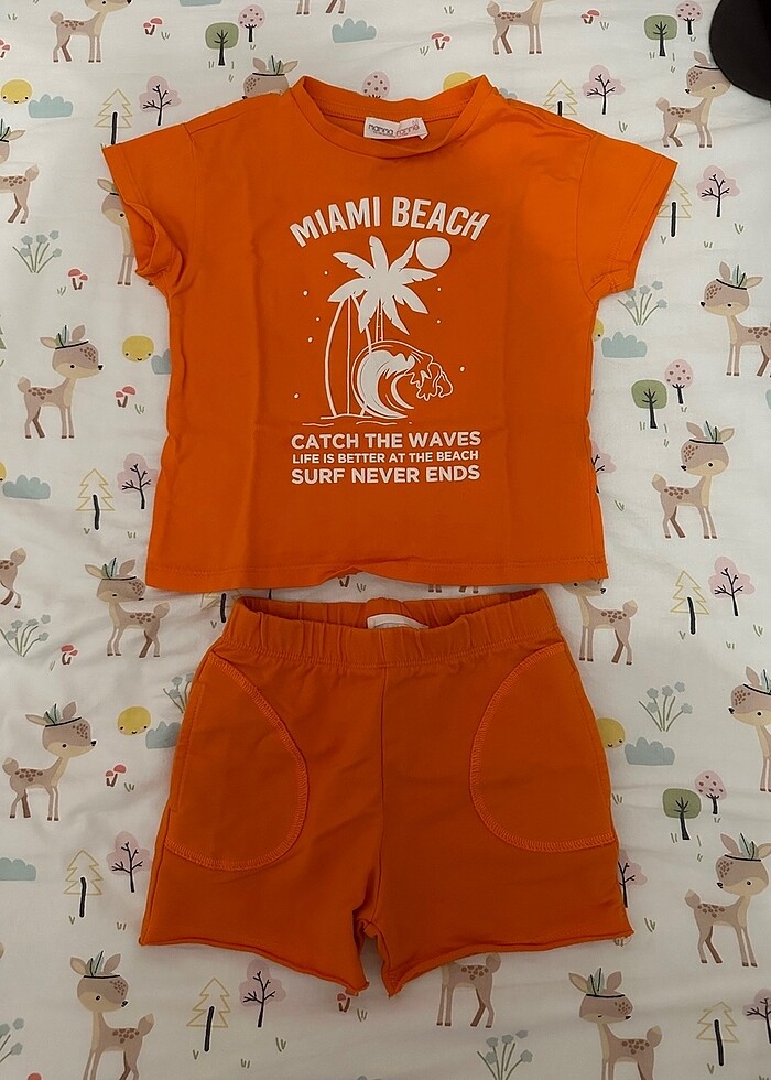 Ürün birkaç defa kullanıldı. Tişörtün önünde küçük bir leke gördüm. Çıkar mı bilemiyorum. 12-18 yazıyor ama kalıp büyük. 24 aylık oğluma oluyordu gecen yıl. Rengi turuncu #mammaramma #şort #tişört #bebek