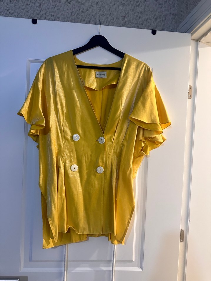 Düğmeli, parlak sarı saten kumaştan yapılmış