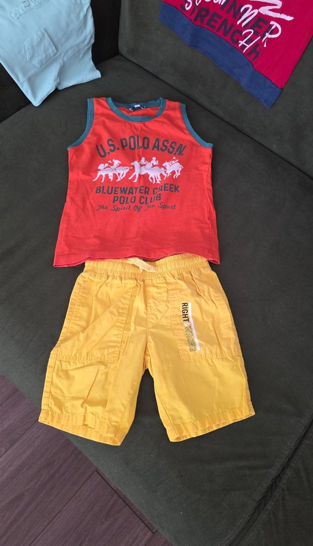 Pamuklu, kolsuz, U.S. Polo Assn. baskılı renkli üst ve canlı sarı şortlu erkek çocuk, hepsi 4-5 yaşa uygun, diğerleri hediye resimdekilerin hepsi dahil