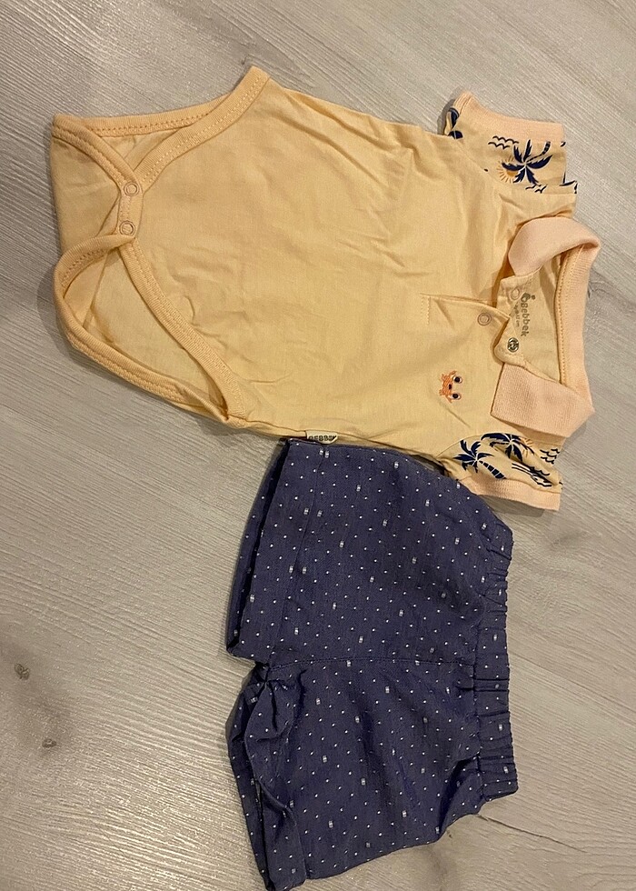 Kısakollu şortlu erkek bebek takım. Ürün hediye geldi ama ay ve mevsim uyuşmazlığından giyilemedi. 3 ay bedeni. 1 kere fotoğraf çekmek için evde giyildi.