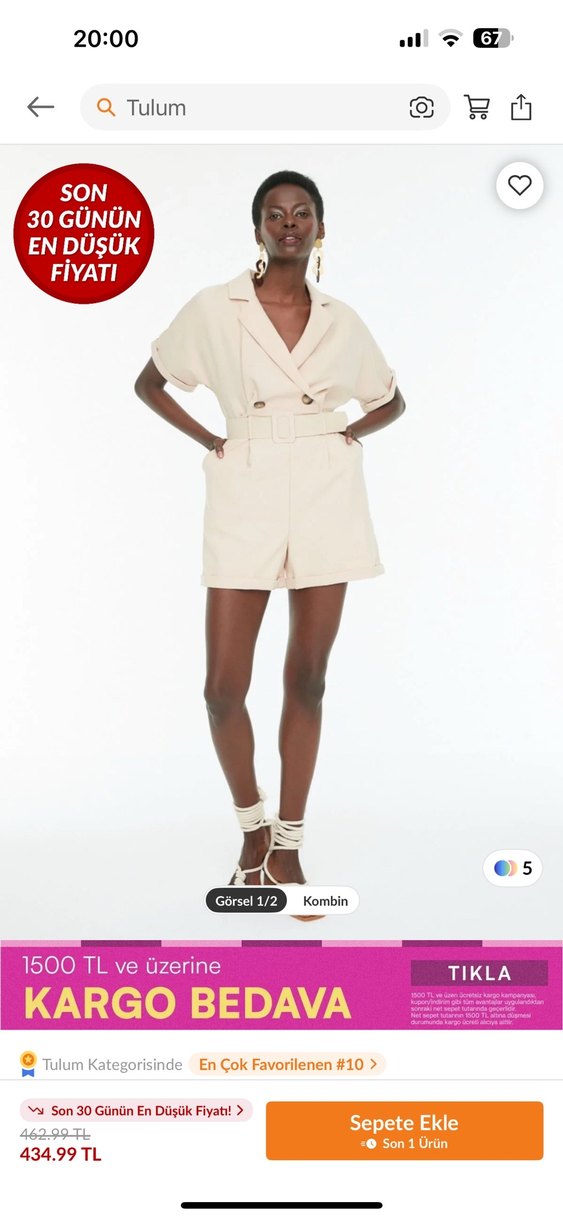 Bej renkli, kemerli kadın tulum. Hiç kullanılmamıştır.