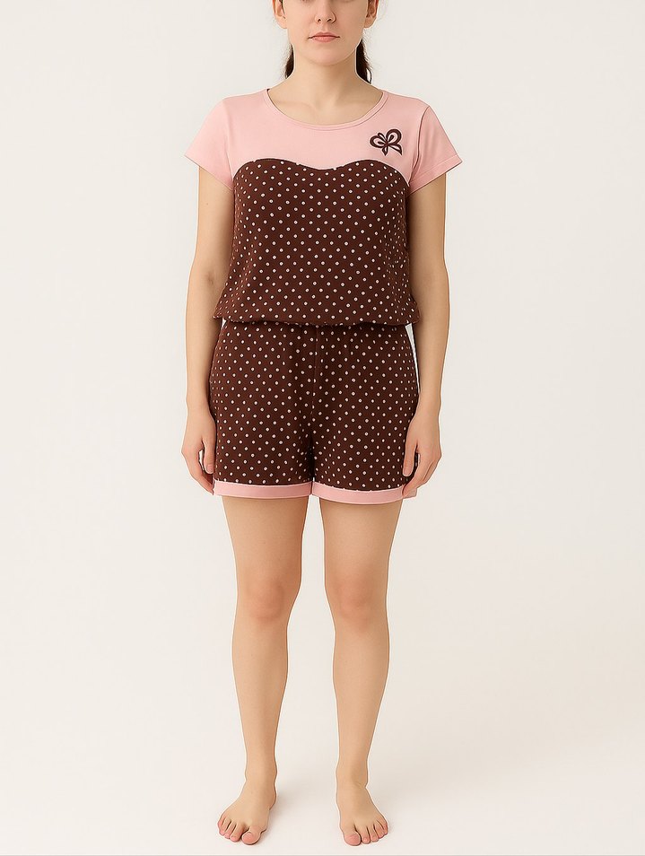 Kadınlar için kısa kollu ve şortlu, . Pastel kahverengi puantiyeli desenle rahat ve şık bir görünüm sunar.marka temsilidir
