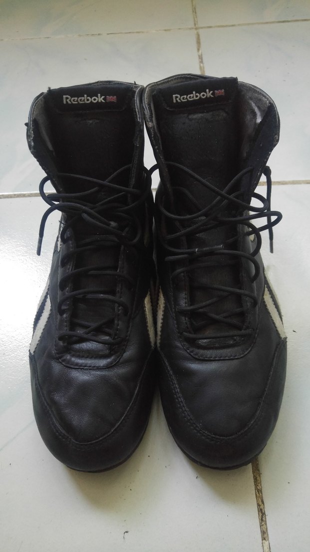 42 Numara Siyah, koyu tonlu, biker tarzı erkek ayakkabıları için bağcıklar. Spor ve gündelik kullanıma uygun. Reebok marka ayakkabılar üzerinde gösterilmiştir.